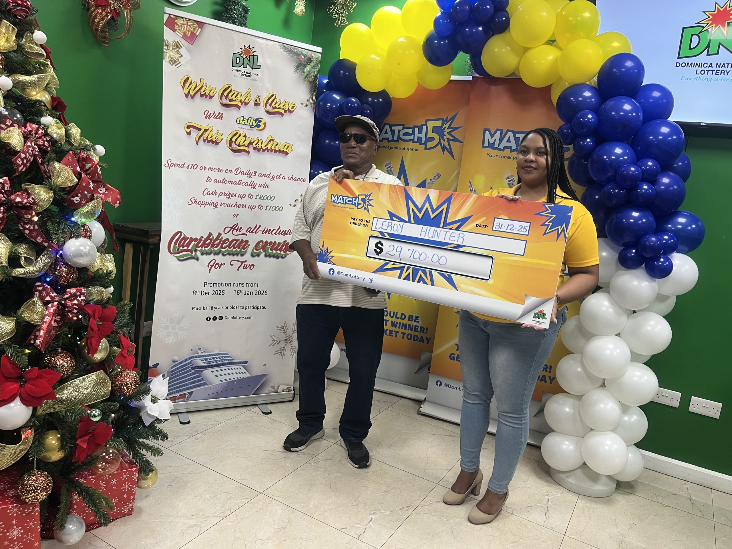 Hunter received a cheque of $29,700.00. Speaking at the brief handing-over ceremony, the Marketing Manager of the DNL, Ken George, stated that for 2025, the company has distributed over $ 10 million and called on persons to continue playing the various games of the DNL.