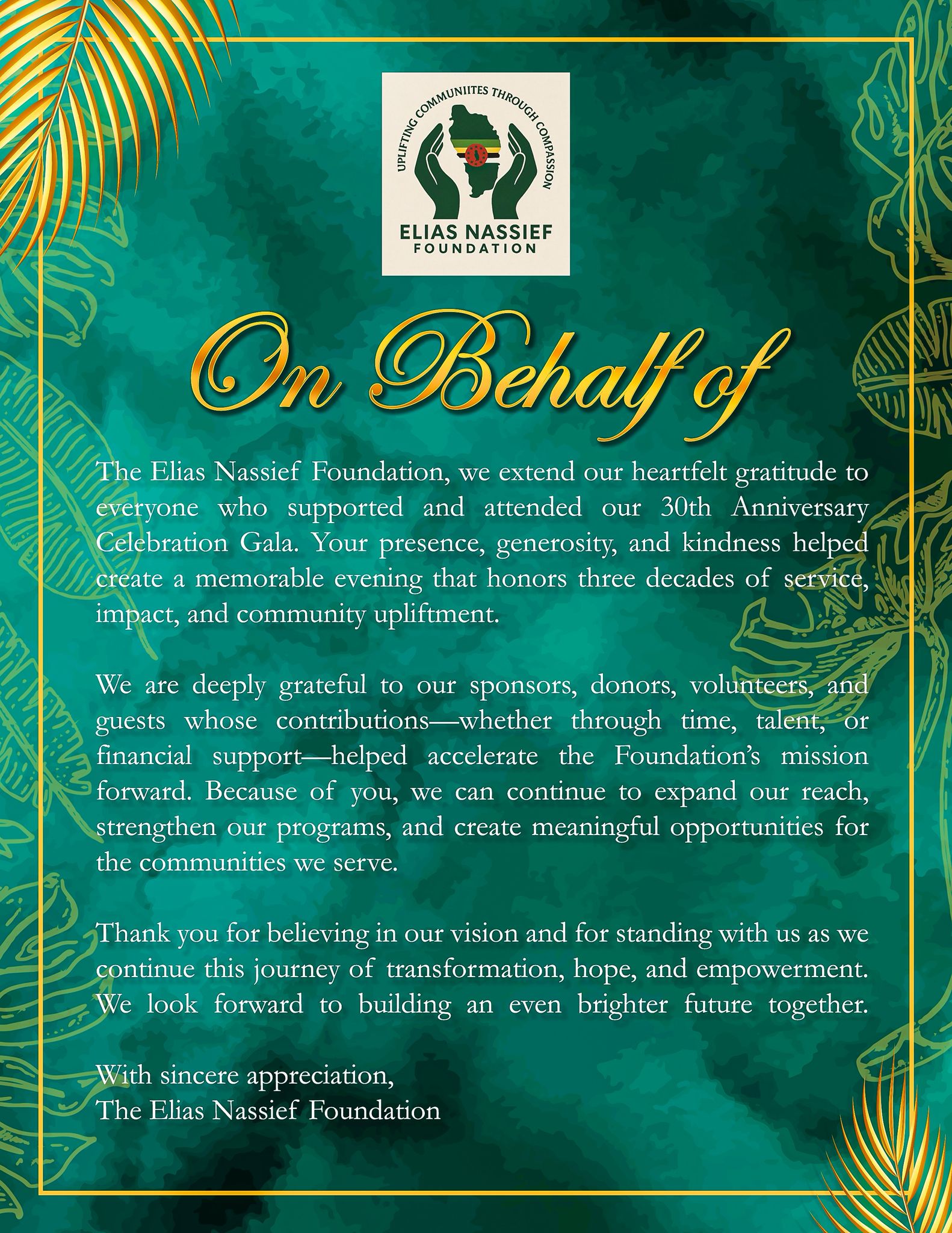 On behalf of the Elias Nassief Foundation, we extend our heartfelt gratitude to everyone who supported and attended our 30th Anniversary Celebration Gala. Your presence, generosity, and kindness helped create a memorable evening that honors three decades of service, impact, and community upliftment.