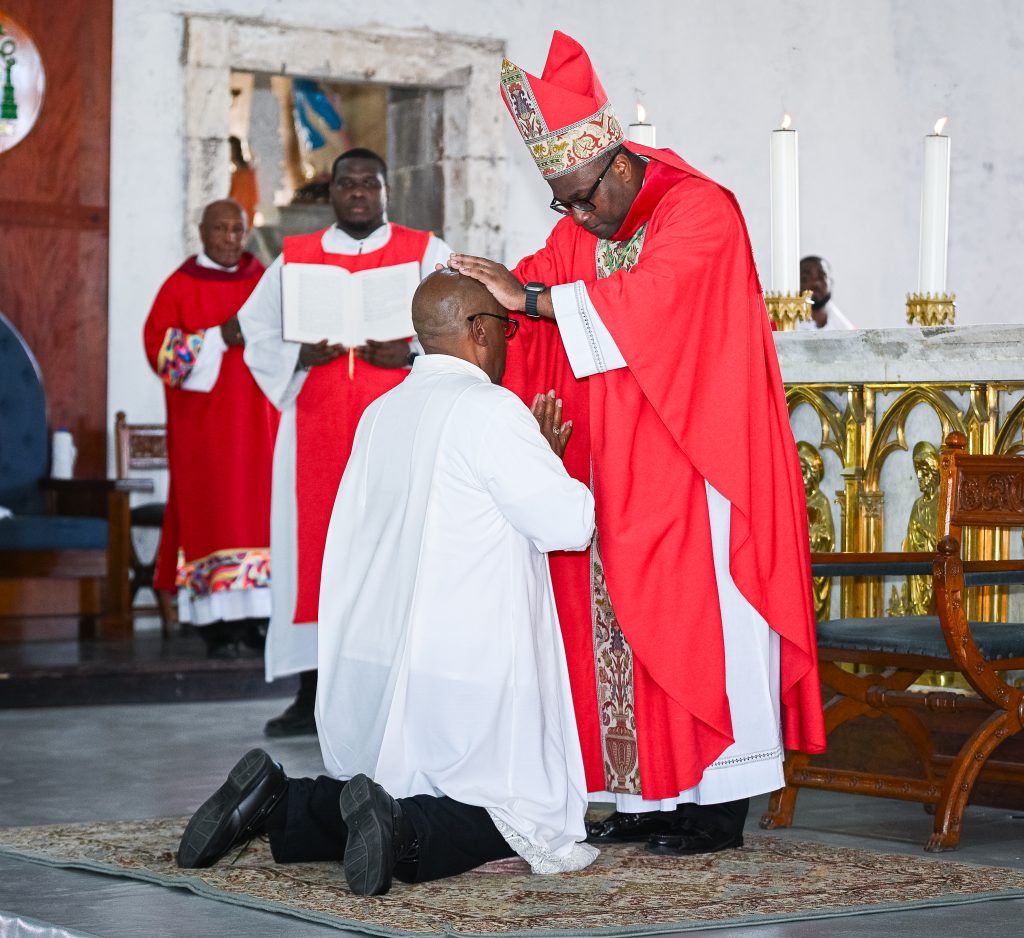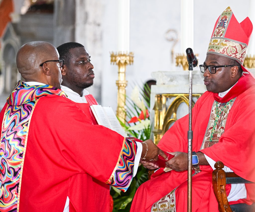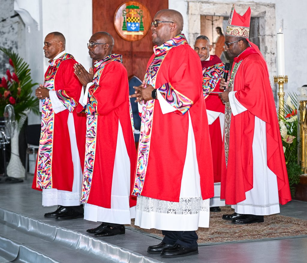 Catholic faithful, family, friends, and well-wishers gathered at Our Lady of Fair Haven Cathedral in Roseau to witness the ordination of Valentine Cuffy, Alganon Degallerie, and Albert Watty as Deacons in the Catholic Church.